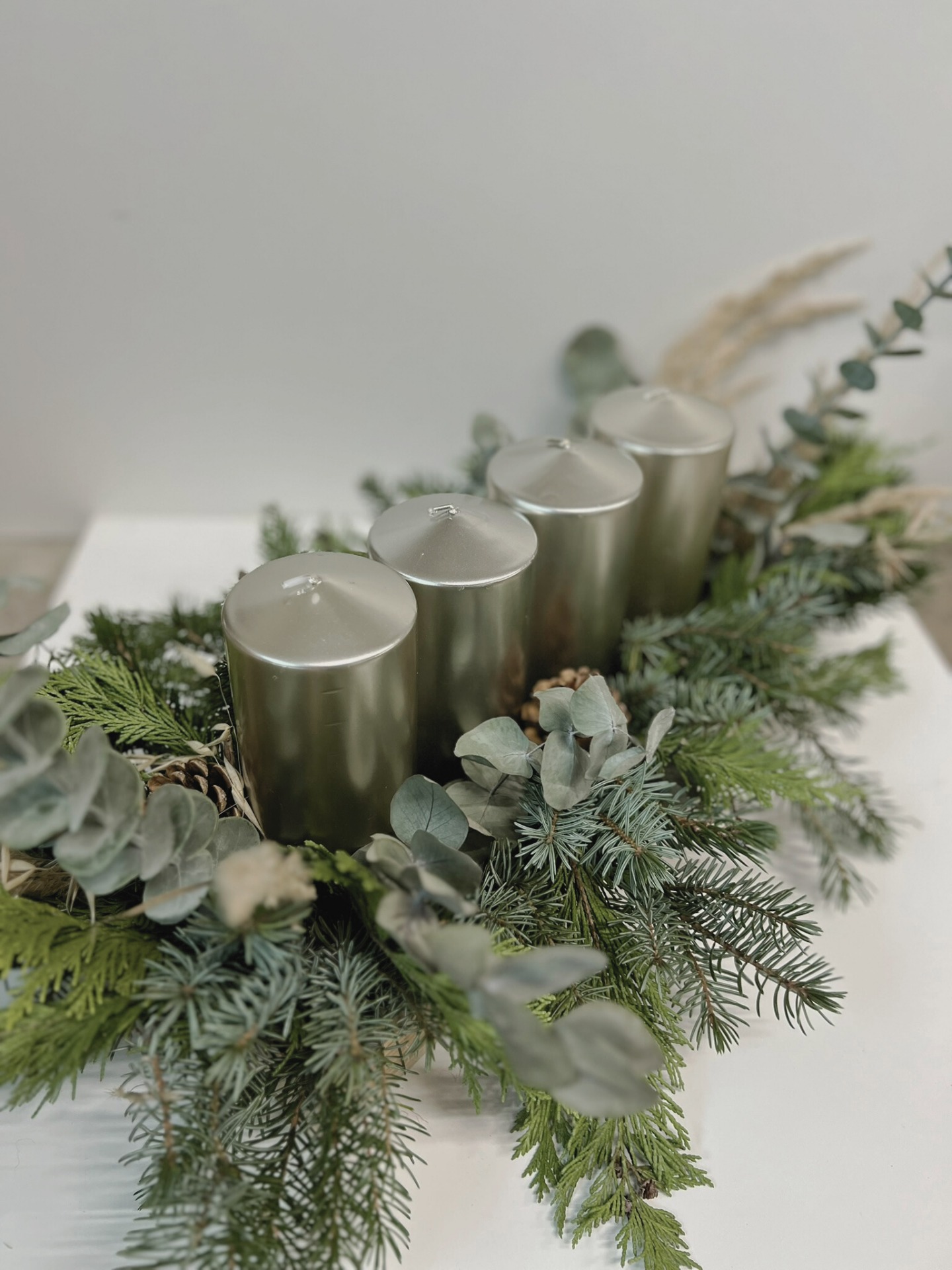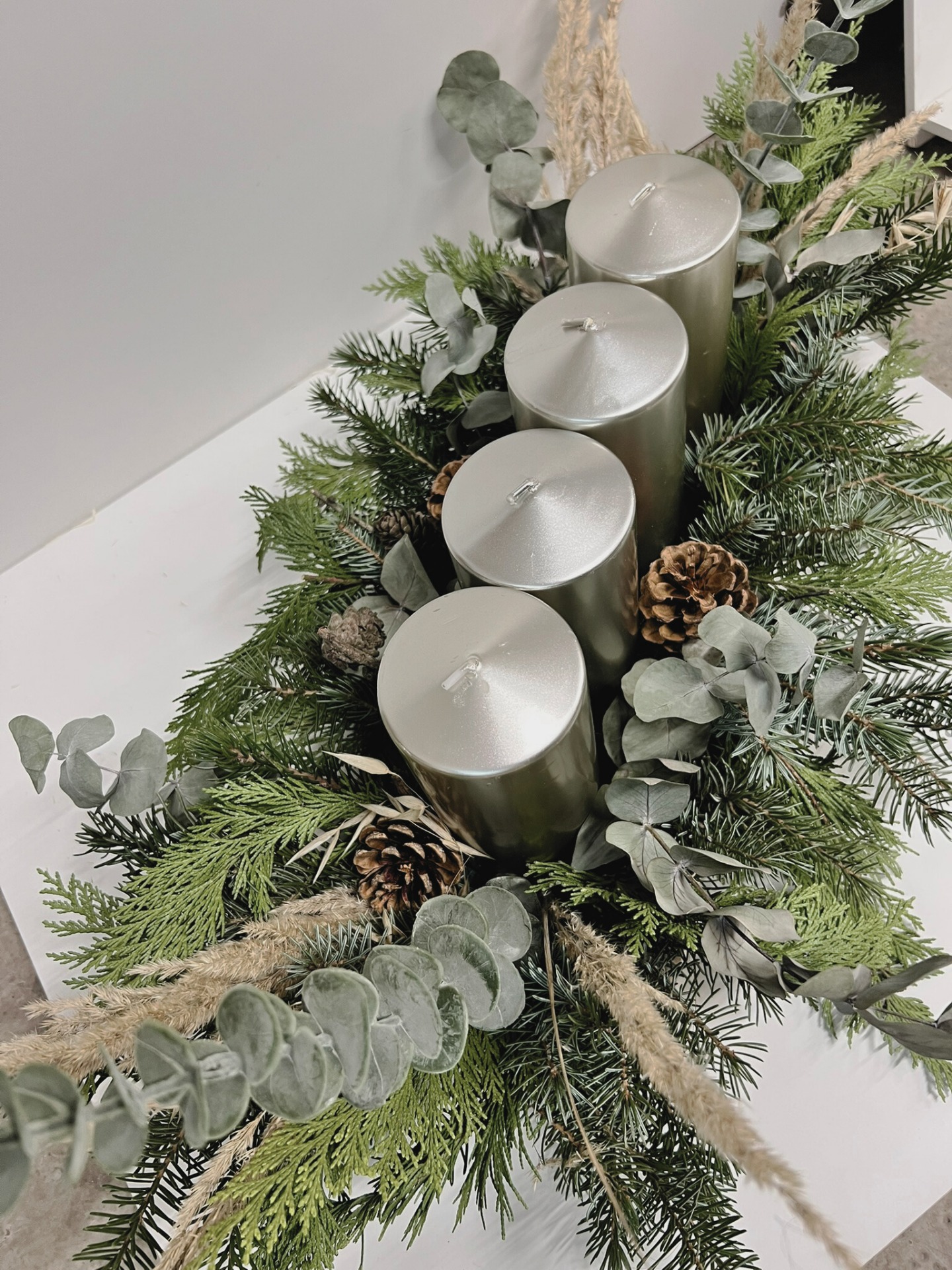 Adventní svícen na dřevěném základu. Živá jedle, eukalyptus a tůje. Délka cca 50cm, šířka cca 30cm.