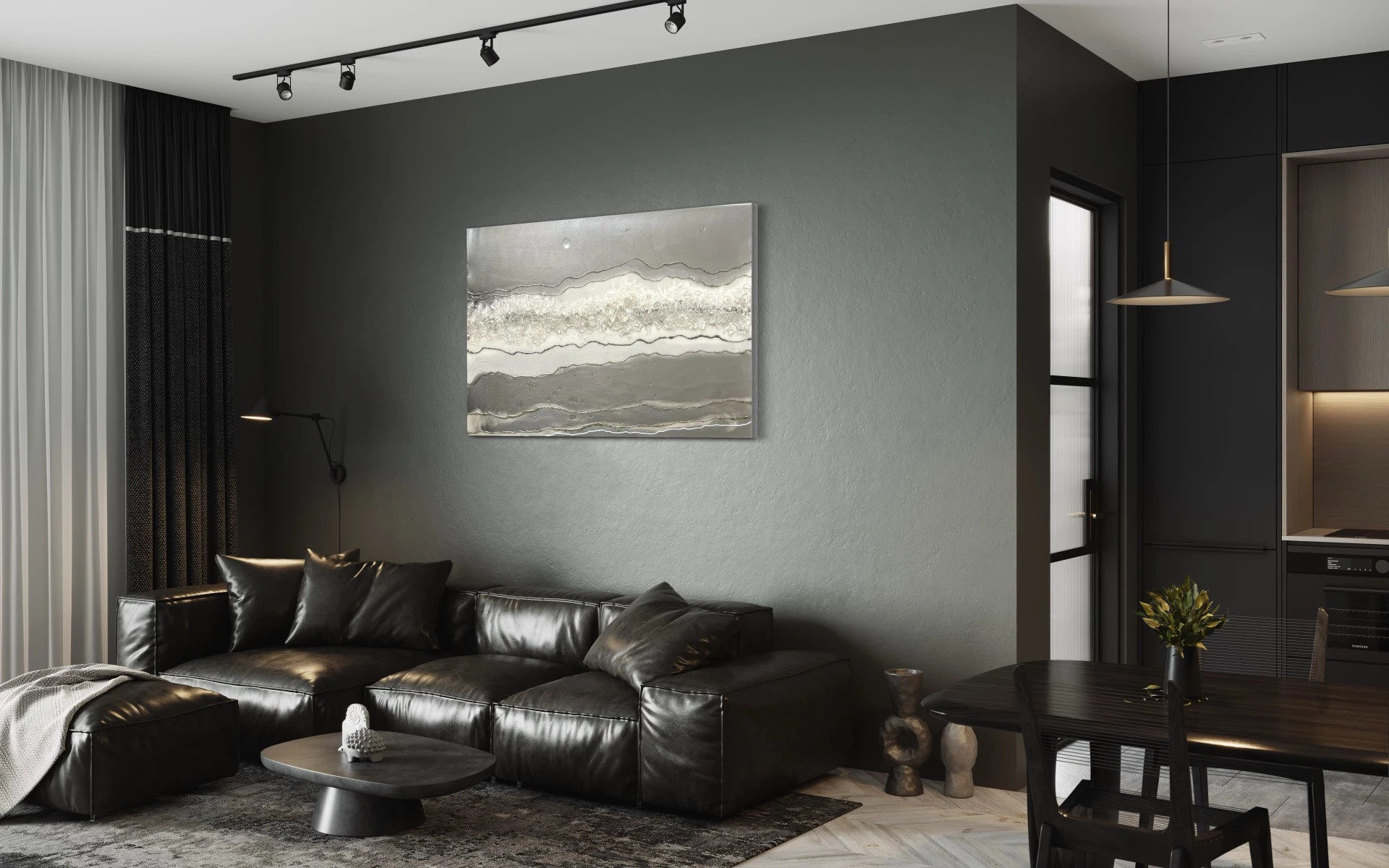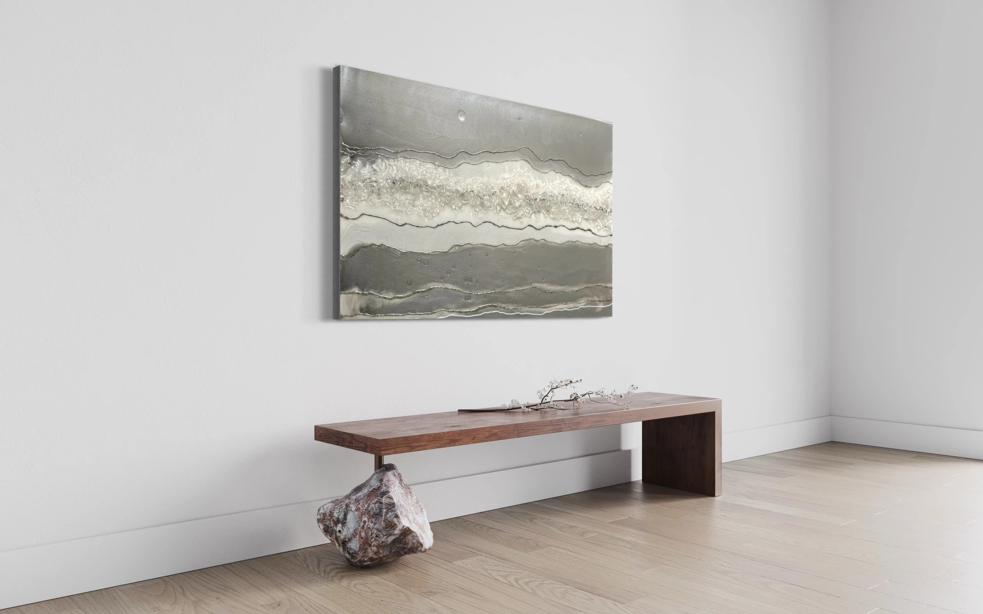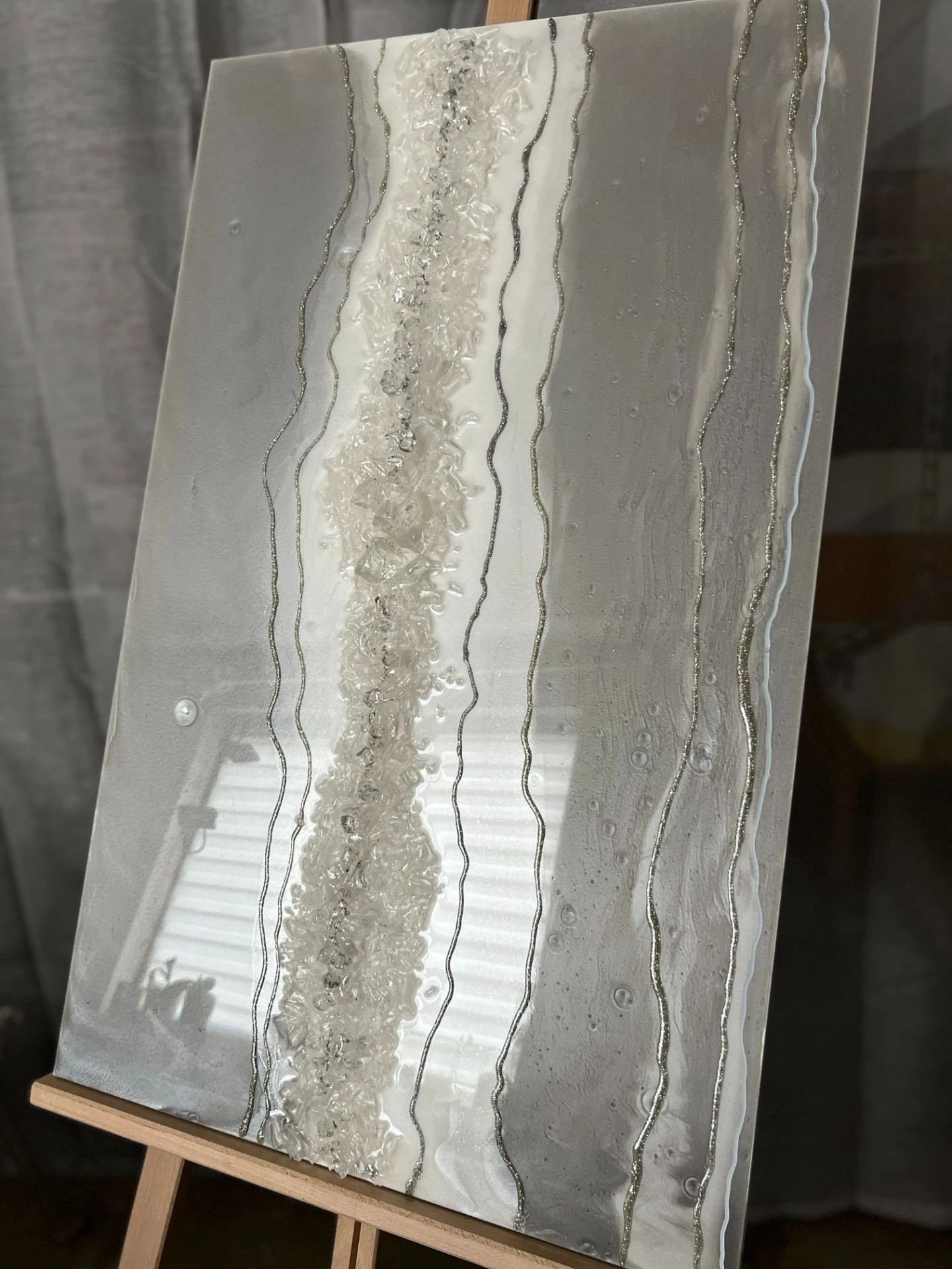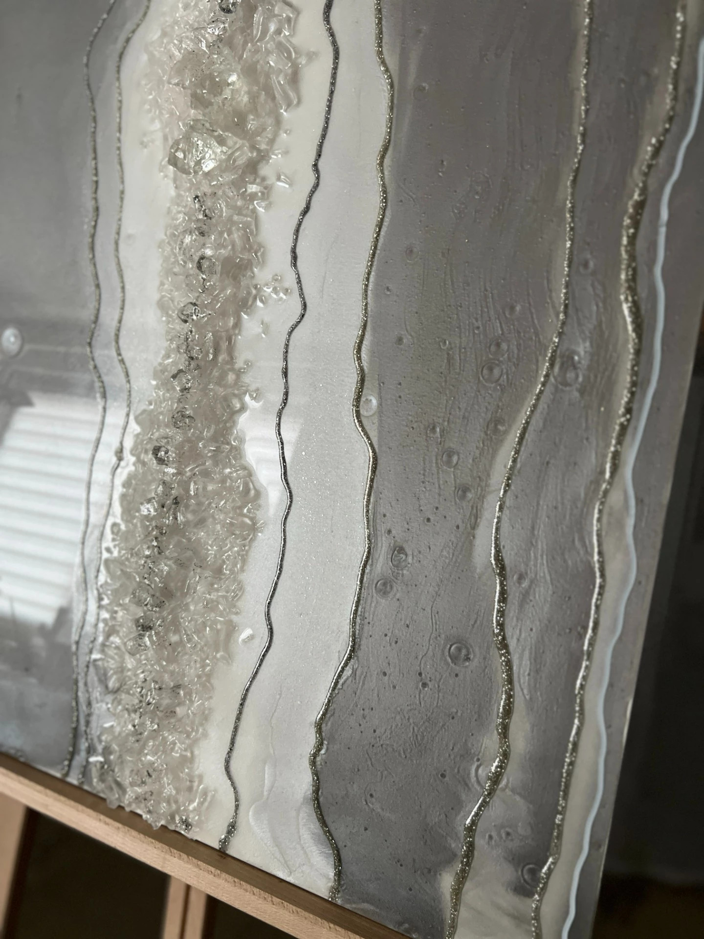 Obraz z pryskyřice na dřevěné desce. Velikost 80 x 50cm. Obraz je zdoben křišťálovými kameny, metalickými pigmenty a má nádhernou strukturu tvořenou třpytivou linií a to vše umocňuje vysoký lesk epoxidové pryskyřice. Obraz je inspirovaný měsíčním povrchem. Tento výjimečný obraz se hodí skoro do každého interiéru v zemitých nebo studených barvách.